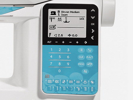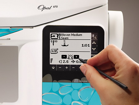 Машина обладает сенсорным экраном 64х48 мм, на котором отображаются выбранные строчки в реальном масштабе со всеми установленными параметрами. Управление очень легкое и чуткое благодаря стилусу, входящему в комплект.
